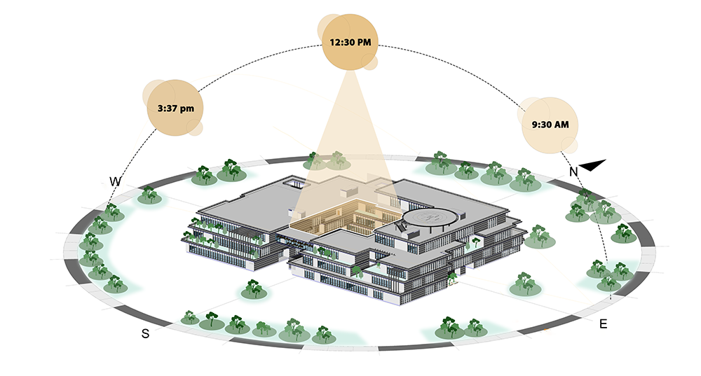 فضای سبز فضاهای سبز در حیاط مرکزی بیمارستان نقش حیاتی در بهبود کیفیت زندگی بیماران و کارکنان درمانی دارند. حضور درختان، گلها و چمنها به ایجاد محیطی آرام و دلپذیر کمک میکند که میتواند استرس و اضطراب بیماران را کاهش دهد. تحقیقات نشان دادهاند که حضور در فضاهای سبز باعث بهبود حالت روحی و افزایش احساس خوشحالی میشود. علاوه بر این، این فضاها میتوانند به عنوان مکانهایی برای استراحت و تجدید انرژی پرستاران و پزشکان مورد استفاده قرار گیرند.