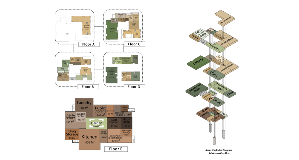ورودی اصلی در طراحی بیمارستان، مهمترین اصل طراحی، چیدمان فضاها و ارتباط بین آنهاست که تمامی این اصول طراحی در پلان این بیمارستان به وضوح قابل مشاهده است.